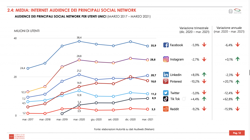 Analizzando i dati di utilizzo di Internet, nel mese di marzo 2021, 44 milioni di utenti medi giornalieri hanno navigato in rete per un totale di 66 ore di navigazione mensile a persona. Passando all’esame dell’audience dei principali social network, Facebook è sempre al primo posto, con 35,9 milioni di utenti unici, ma in 1 anno ha perso 2,5 milioni di iscritti. Performance in controtendenza si riscontrano esclusivamente per Pinterest (+3,1 milioni di utenti per un totale di 18 milioni) e Tik Tok (+3,4 milioni di utenti per un complessivo 9 milioni di iscritti).