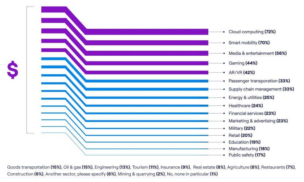 Esaminando le aree chiave di investimento, WWT ha osservato che, come con lo stesso 5G, le applicazioni trasformative si basano in primo luogo sul cloud computing, il che logicamente rende questo settore più attraente dal punto di vista degli investitori. Quasi tre quarti (72%) hanno affermato che il cloud computing vede attualmente investimenti superiori alla media nella tecnologia basata sul 5G. Il cloud è stato seguito dalla smart mobility al 70%, con il 56% che seleziona media e intrattenimento, il 44% che nomina giochi e il 42% AR/VR. Altri settori degni di nota tra gli investitori sono stati la filiera (33%) e la sanità (24%).
