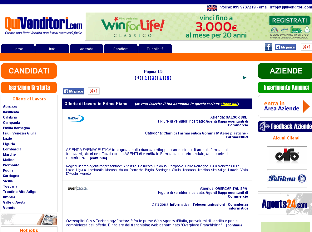 Sul lato sinistro della pagina, invece, ci sono le Offerte di lavoro per singola regione d’Italia. cliccando su Lazio, piuttosto che Lombardia o Campania, si apre la lista di posizioni aperte per singola regione, con evidenziati il profilo ricercato, la categoria/settore di impiego, il tipo di mandato, il recruiter e una breve descrizione dell’annuncio.