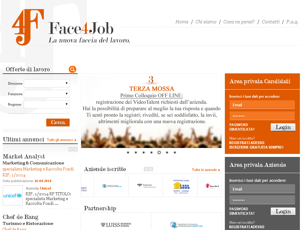 Cerchi lavoro? Vuoi presentare il tuo curriculum vitae in maniera innovativa e originale? Da quasi un anno è online www.face4job.com, piattaforma di web recruitment che offre ai candidati non solo di consultare centinaia di annunci in rete e su misura, ma anche di misurarsi con il mondo del lavoro attraverso video-colloqui personalizzati.