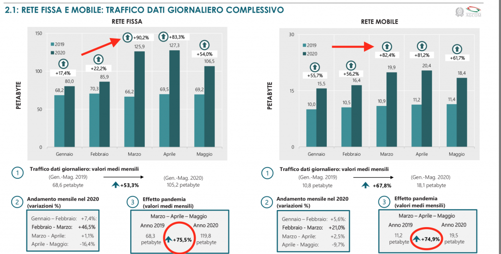La maggiore differenza di traffico dati è stata raggiunta nel mese di marzo con +90,2% di Petabyte giornalieri su rete fissa e 82,4 Petabyte al giorno su rete mobile rispetto allo stesso mese dell’anno scorso: