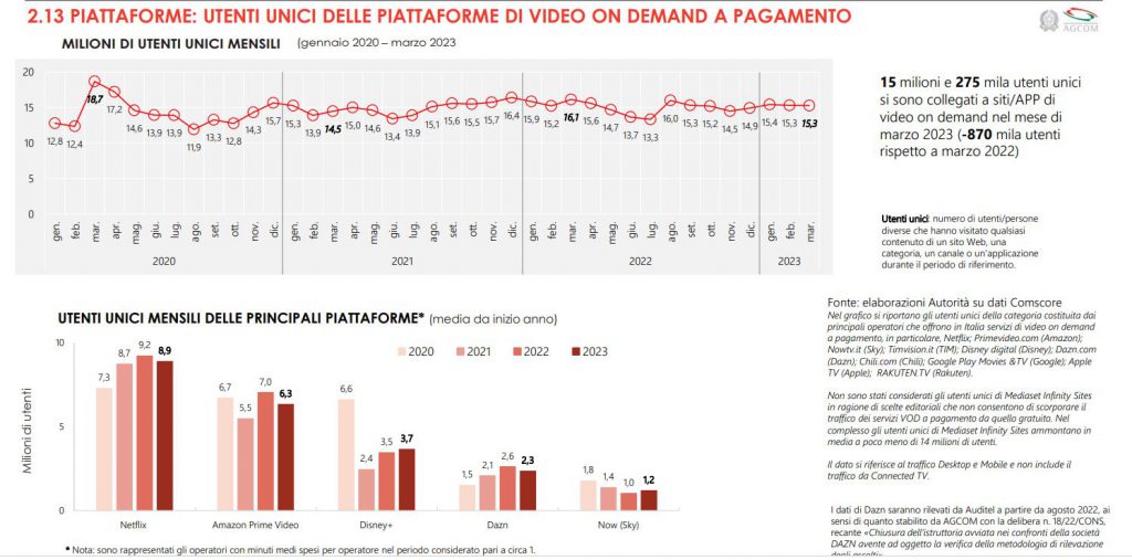 Disney+, con in media oltre 3,7 milioni di internauti, e Sky/Now, con utenti unici medi pari a 1,2 milioni, registrano una crescita (rispettivamente del +5,8% e +15,3%), mentre Dazn (2,3 milioni di utenti unici medi) registra una flessione del -10,2% rispetto ai primi tre mesi del 2022.