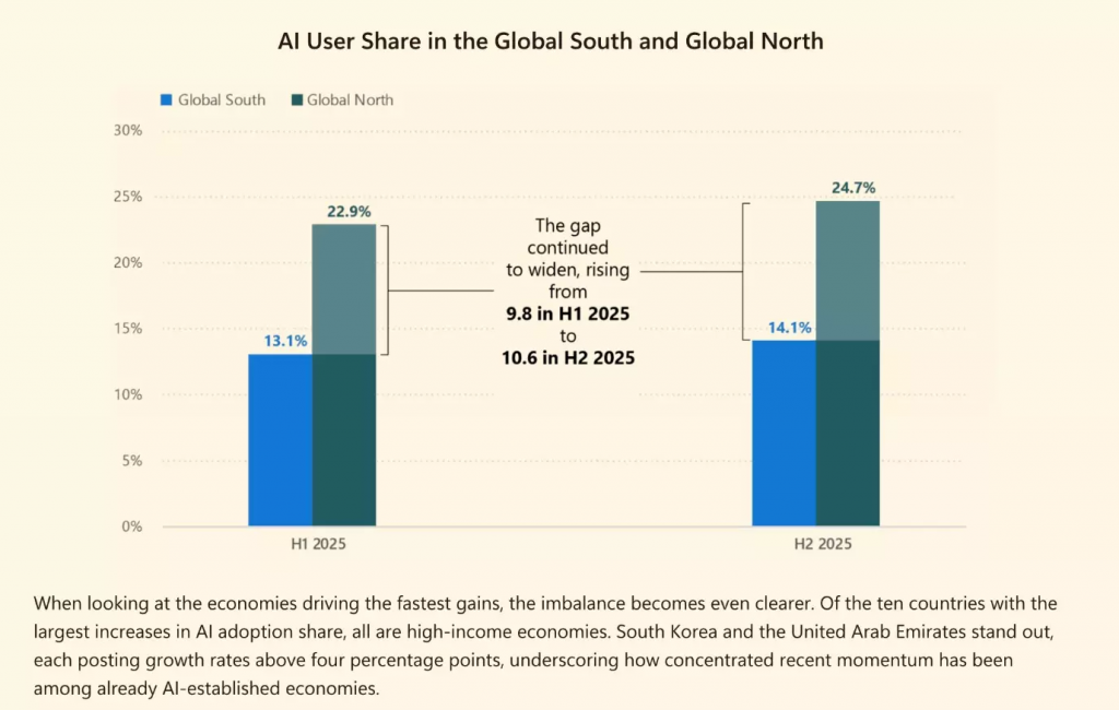 I nuovi dati di Microsoft mostrano che il mondo sta utilizzando l’intelligenza artificiale a livelli record, ma rivelano anche un divario sempre più ampio. L’adozione di strumenti di AI generativa ha raggiunto il 16,3% della popolazione mondiale, rispetto al 15,1% della prima metà del 2025. Oggi circa una persona su sei utilizza l’intelligenza artificiale per apprendere, lavorare o risolvere problemi. Questo progresso è però disomogeneo. Come si vede qui sotto, l’adozione nel Nord del mondo è cresciuta a un ritmo quasi doppio rispetto al Sud, ampliando il divario dal 9,8 al 10,6% dei Paesi. In sostanza, i benefici dell’AI si stanno espandendo, ma non in modo uniforme.