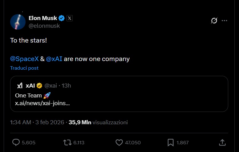 xAI è ufficialmente integrata in SpaceX. È riportato anche nel sito del gigante della Space Economy, portando il valore complessivo delle due aziende a 1,25 trilioni di dollari: “SpaceX ha acquisito xAI per dare vita al più ambizioso motore di innovazione verticalmente integrato sulla Terra (e non solo), con intelligenza artificiale, razzi, internet spaziale, comunicazioni dirette verso dispositivi mobili e la piattaforma di informazione e libertà di parola più avanzata al mondo“.