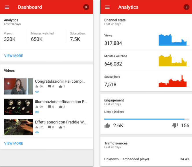Dopo aver creato, editato (magari con un’altra app molto interessante come Upshot) e caricato il video, attraverso YouTube Creator Studio potrai tenere sott’occhio tutto quel che conta, dai commenti alle statistiche passando per le informazioni relative a ogni singolo filmato. Tutto qui, semplice e pulito, con una grafica senza orpelli che richiama l’app madre.