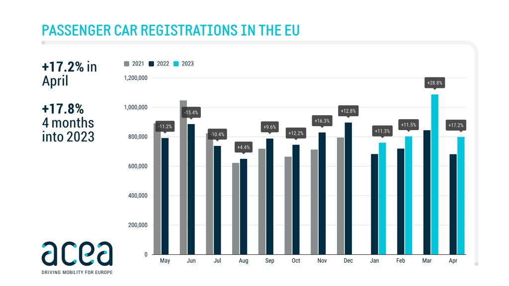 Nei primi quattro mesi dell’anno, il mercato auto europeo è cresciuto del 17,8% a 3,5 milioni di nuovi veicoli acquistati. Il paragone con lo stesso periodo del 2019, però, è ancora negativo, mancano all’appello il 23% circa delle immatricolazioni.