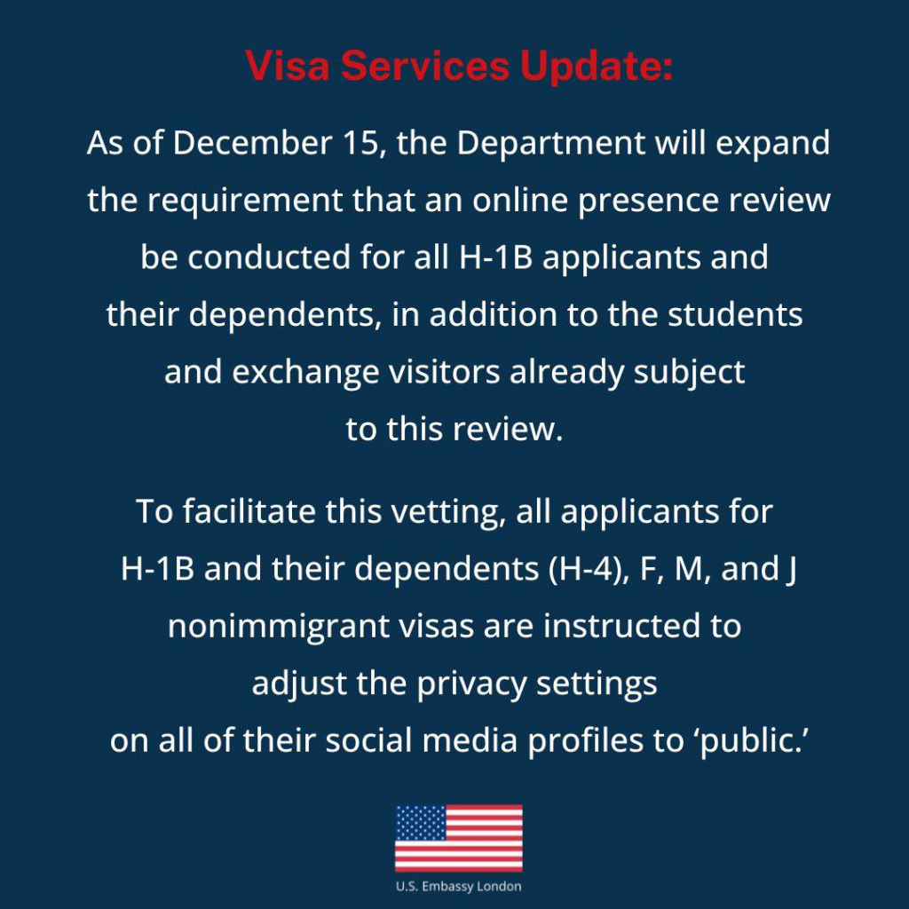 A partire dal 15 dicembre, il Dipartimento di Stato statunitense estende l’“online presence review” – il controllo della presenza online – non solo a studenti e visitatori di programmi di scambio (visti F, M e J), ma anche a tutti i richiedenti visti H-1B e ai loro familiari (H-4). Fin qui, si potrebbe dire, si tratta di un rafforzamento dei controlli di sicurezza.