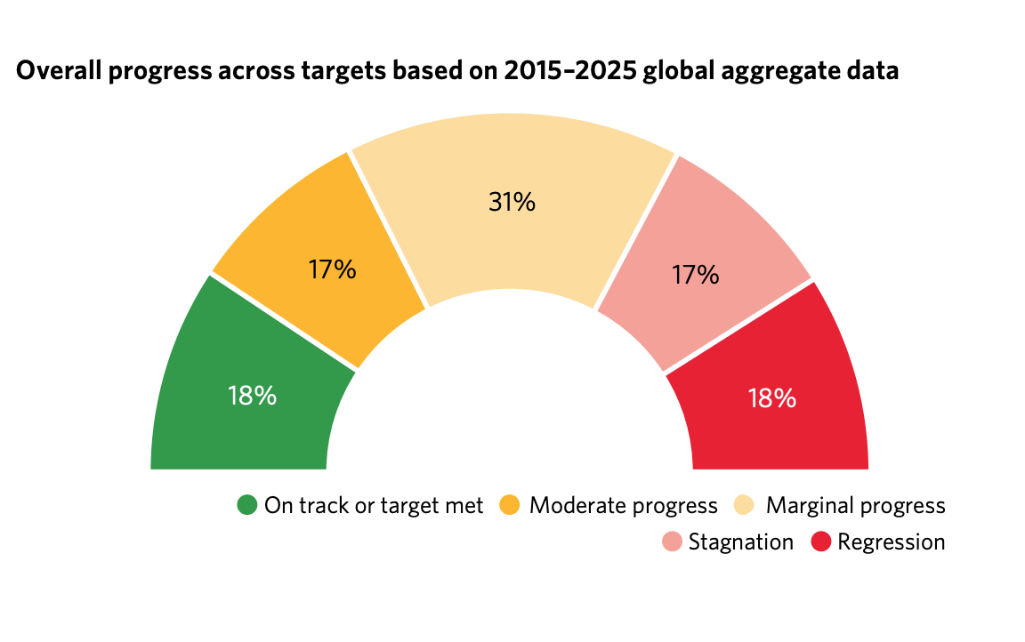 I progressi nello sviluppo sono stati disomogenei. Oltre 800 milioni di persone vivono ancora in condizioni di povertà estrema; la fame colpisce 1 persona su 11 a livello globale; 1,12 miliardi di persone nel mondo vivono in baraccopoli o insediamenti informali; nel 2024, 2,2 miliardi di persone non disponevano di acqua potabile; 3,4 miliardi non disponevano di servizi igienici e 1,7 miliardi non disponevano di servizi igienici di base in casa. A metà 20024 la popolazione globale di rifugiati è salita a 37,8 milioni. Gli aiuti pubblici allo sviluppo sono diminuiti del 7,1% nel 2024 dopo cinque anni di crescita, con ulteriori tagli previsti fino al 2025. Donne, persone con disabilità e comunità emarginate continuano a subire svantaggi sistemici.
