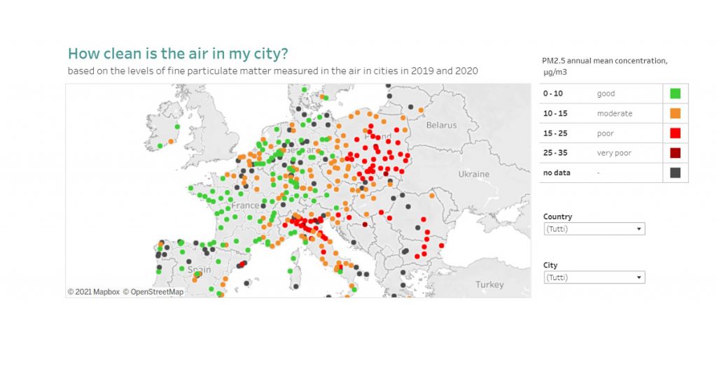 Il particolato fine (PM2,5) è un agente inquinante particolarmente pericoloso per la salute umana. Nel 2018 in tutta Europa sono morte prematuramente 417 mila persone, proprio a causa dell’aria inquinata.