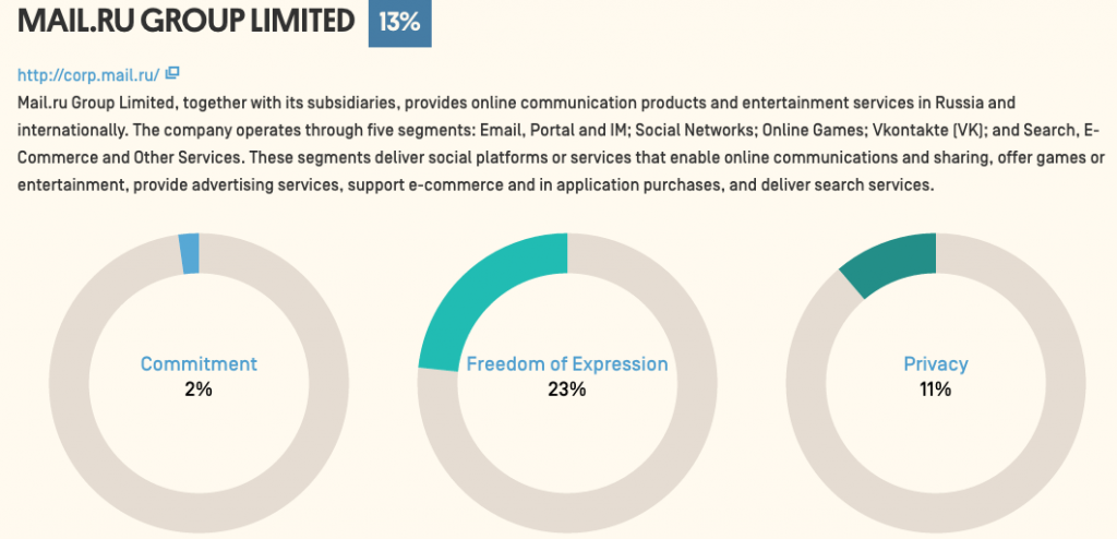 Mail.ru, conosciuto per lo più in Russia perchè è il servizio di posta elettronica principale, lo troviamo in ultima posizione con dei risultati a dir poco agghiaccianti. La compagnia ha raggiunto un punteggio del 13%, il più basso tra le imprese valutate. Ranking Digital Rights attribuisce parte della sua bassa valutazione alla legge russa, che richiede che le imprese attuino il sistema di sorveglianza del governo, chiamato SORM, che fornisce alle autorità l’accesso ai dati dei clienti. Questo contesto giuridico, compromette chiaramente la protezione della privacy e, soprattutto, la libertà di espressione degli individui.