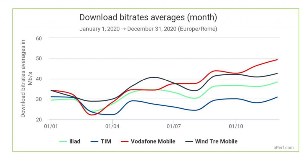 Qui aiutano a capire la situazione i dati di nPerf, che evidenziano chi ha fatto meglio sia per quanto riguarda la velocità di download che di upload, entrambe garantite per il 2020 da Vodafone: per il download, una media di 37,49 Mb/s per l’operatore “rosso”, rispetto ai 36,41 Mb/s di Wind, comunque in crescita del 26% rispetto all’anno precedente, e ai 32,43 Mb/s di Iliad (+16%), con in fondo TIM (27,42 Mb/s); per l’upload, Vodafone guida con una media di 10,69 Mb/s, davanti a TIM con 9,59 Mb/s e WindTre con 9,56 Mb/s, ultima Iliad con 7,54 Mb/s. Qui il fenomeno più particolare è, come si vede dalle immagini, il calo di entrambe le velocità nei primi mesi dell’anno, effetto dell’arrivo del Covid che ha colto di sorpresa anche gli operatori, che con il tempo sono riusciti a tornare sui vecchi valori e a migliorarli. Solo per chi è raggiunto dal servizio, ovviamente: per gli altri ci sarà ancora da aspettare.