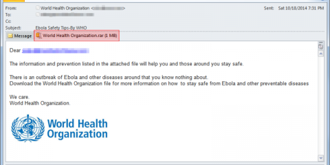 Le campagne sono state rilevate dai Security Labs di Websense che informano che i criminali informatici, spacciandosi per l’Organizzazione Mondiale per la Sanità (World Health Organization – WHO), inviano dei messaggi nel cui oggetto è scritto ‘Ebola Safety Tips-By WHO’ e spingono gli utenti a cliccare su dei link attraverso i quali prendono poi il controllo del Pc e rubano le informazioni in esso contenute.