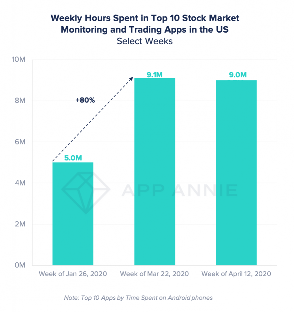 Secondo i calcoli di App Annie, dalla settimana-tipo del 29 dicembre a quella di più intensi effetti del lockdown in USA, dal 12 al 18 aprile, il tempo passato sulle app di finanza è aumentato del 55%: numeri importanti che impallidiscono di fronte al 90% e all’85% della Corea del Sud e del Giappone. Paesi con economie floride, anche se con le loro debolezze, e con un certo di livello di risparmio che rende possibile pensare a come impiegare il proprio denaro.