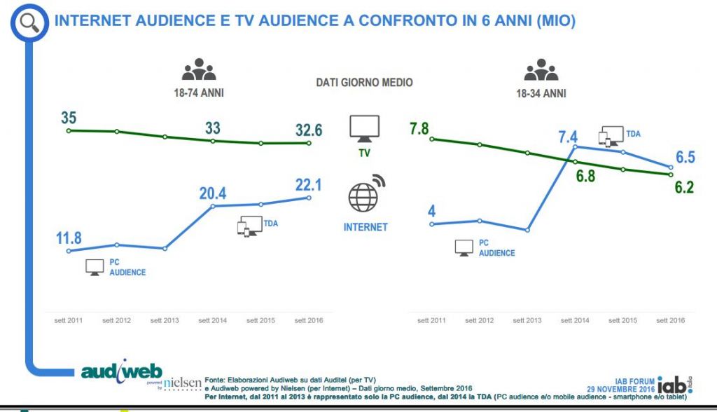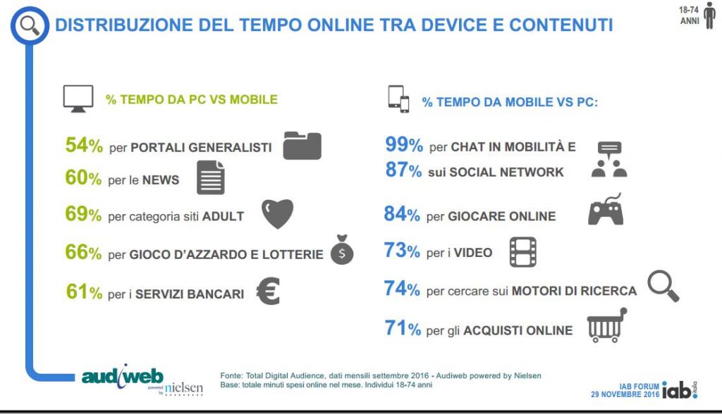La mobile audience sorpassa l’audience da PC. Secondo i dati di Audiweb, illustrati dal Presidente Marco Muraglia allo Iab Forum, lo scenario di fruizione del web in Italia (dati su settembre 2016) mostra 25,2 milioni di utenti unici (online da smartphone e/o tablet) e 22,1 milioni di utenti da Pc. Ma gli italiani non rinunciano del tutto al PC per navigare: sono, infatti, 20.8 milioni gli utenti online nel mese “cross-device”, sia da mobile che da PC.