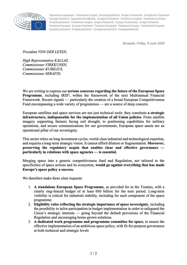 La missiva, sottoscritta in maniera trasversale e condivisa da tutti i gruppi oolitici dell’Europalrmaneto, è stata indirizzata alla Presidente Ursula von der Leyen, all’alto rappresentante l’Alto rappresentante dell’Unione per gli affari esteri e la politica di sicurezza Kaja Kallas, al commissario per la Sovranità tecnologica Henna Virkkunen, al commissario per la Difesa e lo Spazio Andrius Kubilius e al commissario per la Fiscalità e l’Unione doganale Piotr Serafin.
