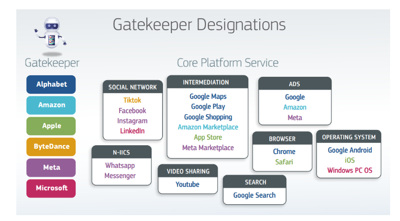 I primi sei “gatekeeper” designati dalla Commissione europea ai sensi del Digital Markets Act (DMA) sono Alphabet, Amazon, Apple, ByteDance, Meta e Microsoft. Queste aziende sono state identificate per la loro grande dimensione e per il ruolo cruciale che svolgono nel controllare l’accesso a un’ampia base di utenti e altri servizi attraverso quelli che l’UE definisce “servizi di piattaforma di base”.