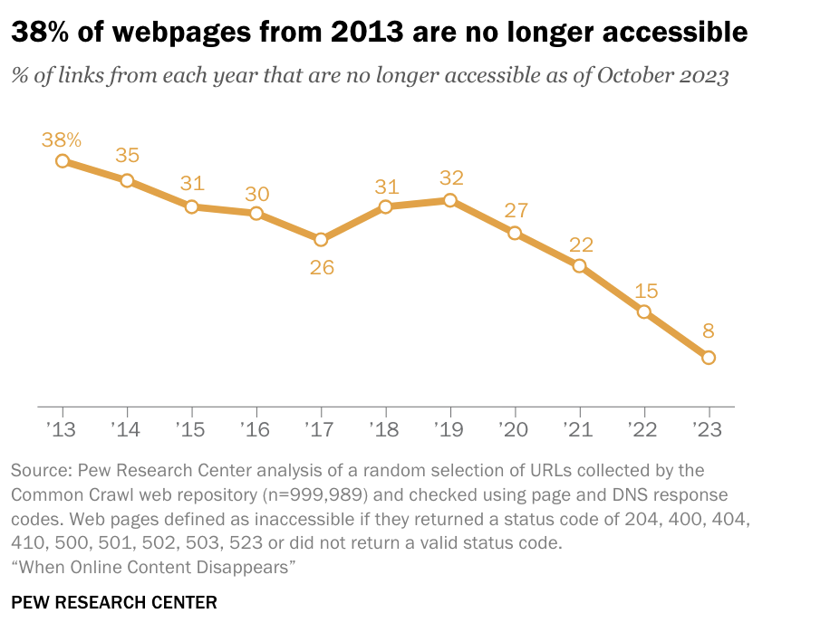 Secondo un report del Pew Reasearch Center, il 38% delle pagine web che esistevano nel 2013 non sono più accessibili e l’8% delle pagine esistenti nel 2023 non sono più disponibili. Nella maggior parte dei casi perché sono state cancellate o rimosse.
