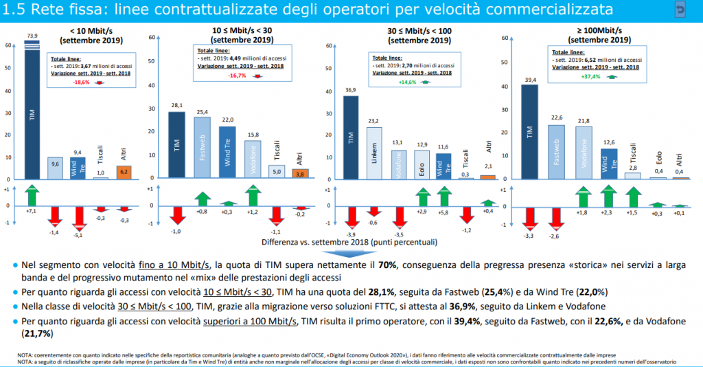 Tale dinamica si riflette in un aumento delle prestazioni in termini di velocità di connessione: le linee con velocità inferiore ai 10 Mbit/s in quattro anni sono passate infatti dal 69,3% (settembre 2015) al 21% del totale delle linee broadband e ultrabroadband, mentre, nello stesso arco di tempo, il peso delle connessioni con velocità pari o maggiore di 30 Mbit/s è cresciuto passando dal 6,6 al 53,1% del totale delle linee broadband e ultrabroadband. Il quadro competitivo nel segmento degli accessi broadband e ultrabroadband vede Tim quale maggiore operatore con il 43,3%, seguito da Vodafone con il 16,3%, e da Fastweb e Wind Tre con quote comprese tra il 14 ed il 15%.
