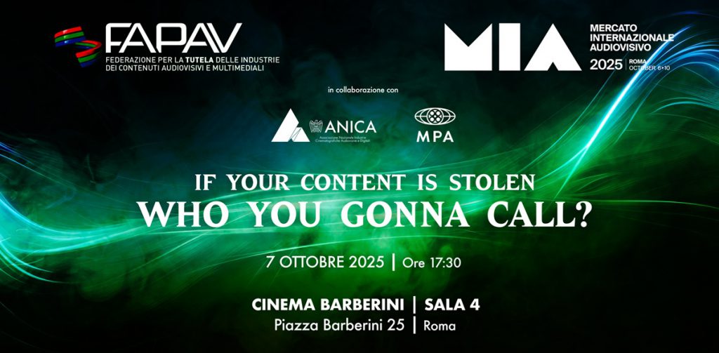 In occasione del Mia Market 2025, per fare il punto sui risultati ottenuti e discutere le prospettive future di questa nuova era anti-pirateria, FAPAV (Federazione per la Tutela delle Industrie dei Contenuti Audiovisivi e Multimediali), in collaborazione con ANICA e MPA (Motion Picture Association), promuove a Roma, presso il Cinema Barberini, un incontro dal titolo: “Se il tuo contenuto è stato rubato, chi chiamerai? Esplorando i nuovi strumenti per la tutela dei contenuti audiovisivi”.