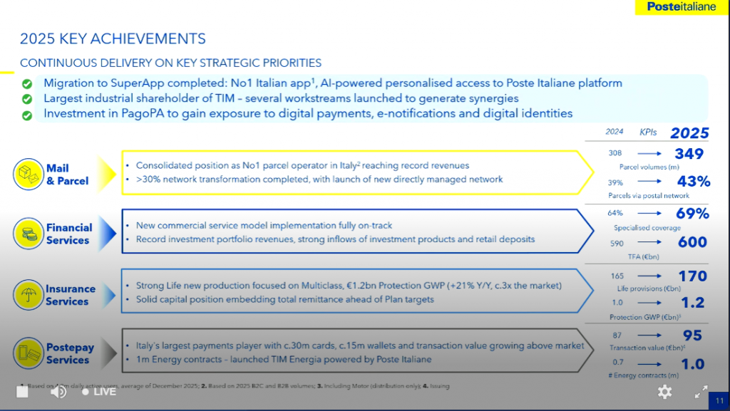 Allo sviluppo della partnership con TIM saranno dedicati diversi cantieri che consentiranno di lanciare nuove iniziative e generare sinergie trai due Gruppi. È già attiva sui c. 700 negozi TIM la vendita dell’offerta PosteEnergia mentre, nell’ultimo trimestre del 2025 TIM ha potenziato la propria offerta di protezione assicurativa per le PMI con le coperture cyber, catastrofali, tutela legale fornite dal Gruppo Poste Vita e, a partire dal primo trimestre 2026, ha ampliato il perimetro ai clienti retail con le coperture casa e cyber.
