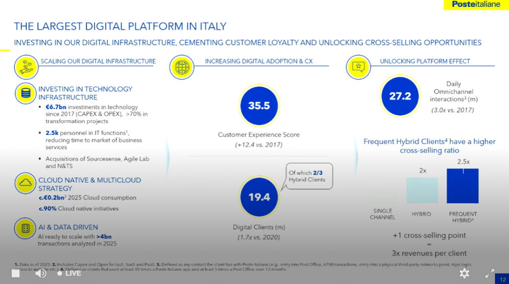 La lettera di intenti firmata alla fine del 2025 per dare vita a una joint venture con TIM Enterprise, dedicata ai servizi IT basati sul cloud segna inoltre un nuovo passo decisivo verso l’innovazione digitale e, nell’ambito dell’obiettivo di sviluppo sinergico del cloud e della sovranità e confidenzialità dei dati, Poste Italiane è in trattativa per acquisire una partecipazione pari al 20% del Polo Strategico Nazionale (PSN), un asset strategico nazionale che fornisce alle Pubbliche Amministrazioni tecnologie e infrastrutture cloud avanzate.