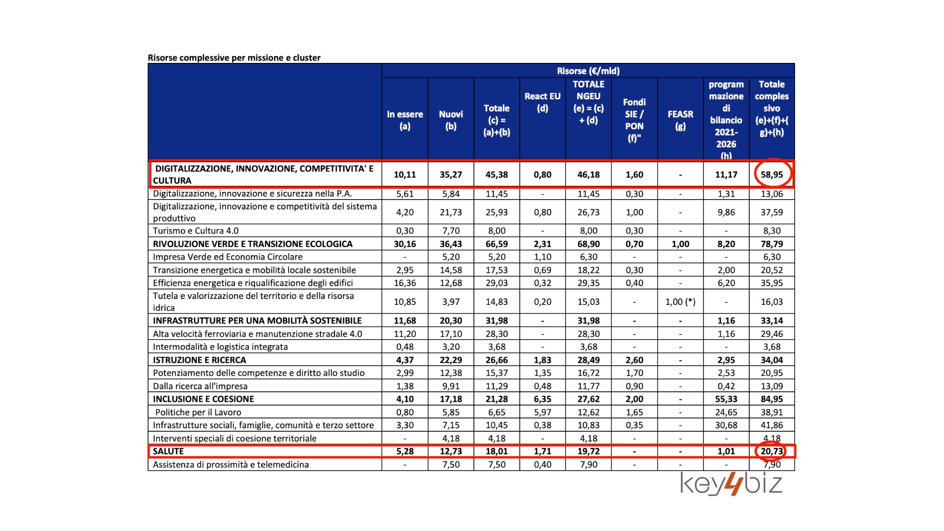 - 12,83 miliardi per Innovazione, ricerca e digitalizzazione dell’assistenza sanitaria.