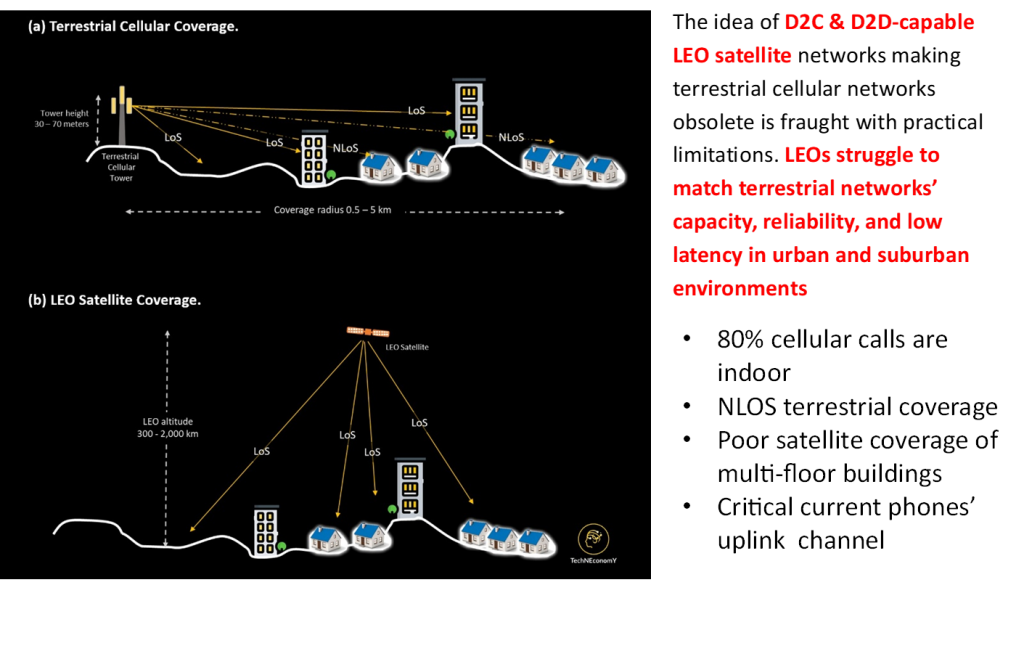 La narrazione di una completa obsolescenza delle torri mobili è irrealistica. I sistemi LEO D2C e LEO D2D anche con smartphone modificati non possono sostituire le reti terrestri, ma sono destinati a ricoprire un importante ruolo complementare.