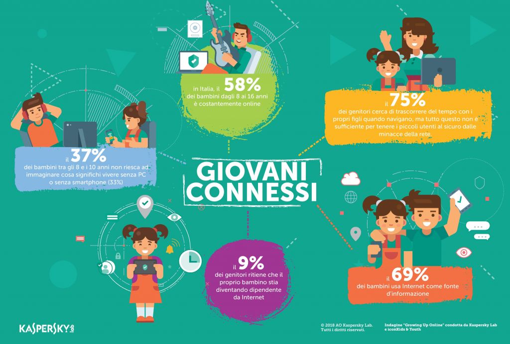 Il dato più allarmante è, però, il tempo trascorso in rete: in Italia il 58% dei bambini dagli 8 ai 16 anni è costantemente online e il 9% dei genitori ritiene che il proprio bambino stia diventando dipendente da Internet.