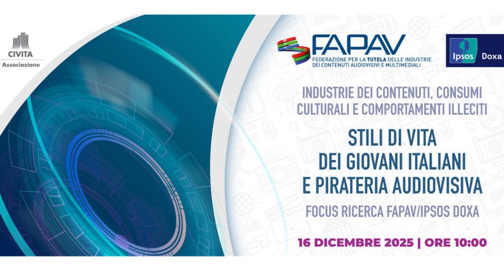 Martedì 16 dicembre, presso l’Associazione CIVITA a Roma, sarà presentato lo Studio realizzato da FAPAV-Federazione per la Tutela delle Industrie dei Contenuti Audiovisivi e Multimediali e Ipsos Doxa su “Stili di vita dei giovani italiani e pirateria audiovisiva”.