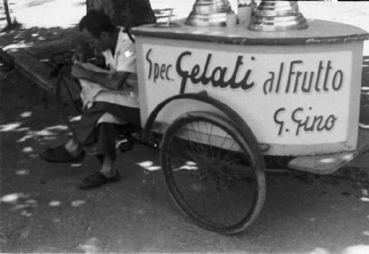 Adesso ci siamo … quasi! … Mamma sta macinando il caffè e questi passi sopra di noi sono di Luciano, Nino e Carlo. No. Non c’é da sbagliarsi. E’ l’ora ! Conto fino a dieci … ancora dieci … sette, otto … Gelatiii! Ora posso aspettare, presto sarà qui … Dov’é questa fermata? Di sicuro, davanti al Comune, l’altra, prima di noi, é all’angolo, fra Battaglia e Carboni. Speriamo che non si squagli … che ci siano pochi bambini … che i grandi non li prendano tutti da 50! Dai! Sbrigatevi! E se poi quando é giù da noi non ci sono più ostie da 20 ?
