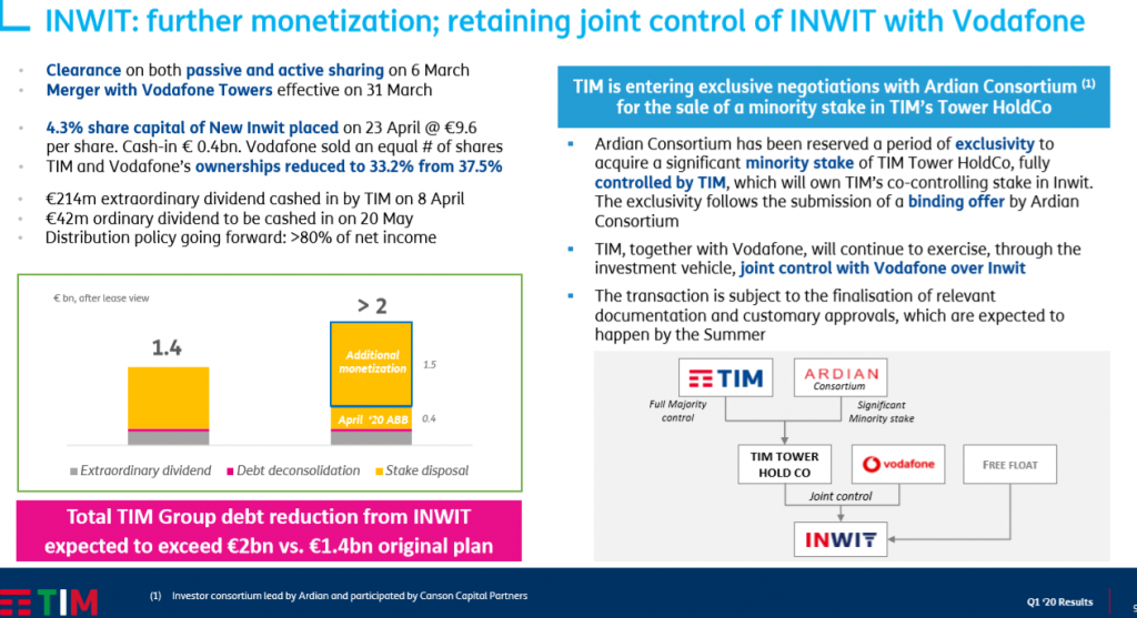 - Network-sharing partnership con INWIT e Vodafone Italia: finalizzato il merger di INWIT con Vodafone Towers il 31 marzo e incrementato il flottante attraverso un “ABB” (Accelerated Book Building) che ha portato la quota paritetica di TIM e Vodafone in INWIT dal 37,5% al 33,2%. Il contributo complessivo alla riduzione del debito di TIM è di circa 650 milioni di euro, considerando il dividendo straordinario (0,2 miliardi di euro) e il collocamento del 4,3% di INWIT (0,4 miliardi di euro), oltre al dividendo ordinario che sarà incassato il 20 maggio. Tim ha inoltre concesso ad Ardian Infrastructure un periodo di negoziazione in esclusiva per l’acquisizione di una quota di minoranza nella holding che deterrà la partecipazione di Tim in Inwit e che rimarrà in pieno controllo di Tim.
