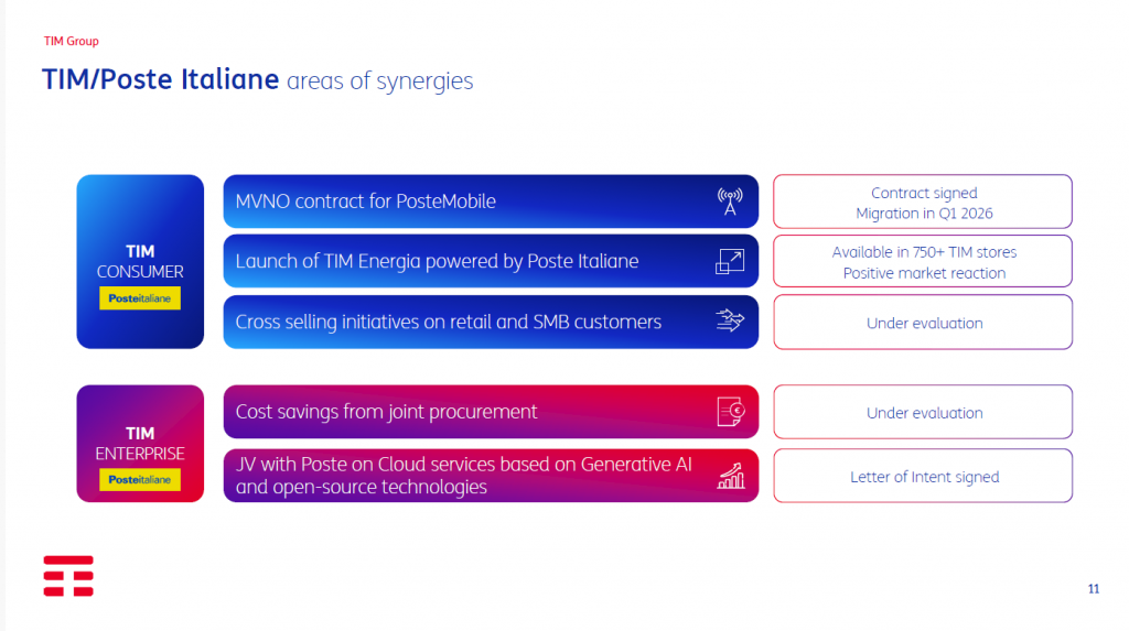 Il Consiglio di Amministrazione ha altresì preso atto della presentazione del management sulle sinergie con Poste Italiane. In particolare, sul fronte Consumer, oltre all’offerta TIM Energia powered by Poste Italiane, lanciata alla fine del terzo trimestre, è stato siglato il contratto di MVNO per PosteMobile, con la migrazione dei clienti attesa nel primo trimestre del 2026, e sono state avviate valutazioni su iniziative di cross selling per i clienti retail e SMB.
