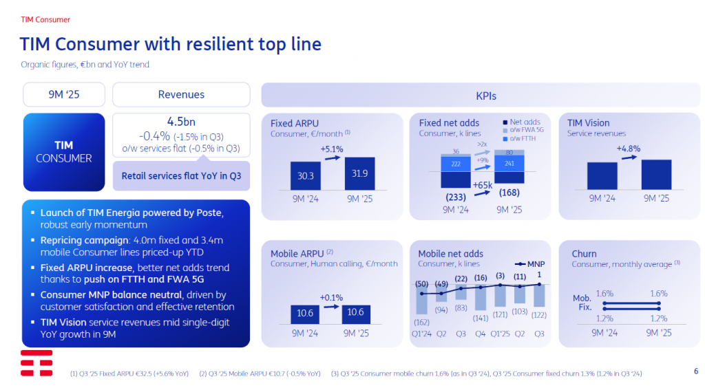 - Tim Consumer ha registrato ricavi sostanzialmente stabili a 4,5 miliardi (-0,4%)
