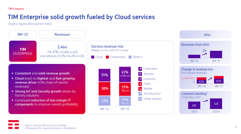 “Il Cloud si conferma la principale linea di business e quella a maggior crescita, con un aumento dei ricavi da servizi del 23% anno su anno, anche grazie ai servizi offerti al Polo Strategico Nazionale. Sale al 65% (+3 punti percentuali anno su anno) la percentuale di ricavi da servizi legata all’ICT, mentre è in leggero calo la connettività. In aumento la quota di ricavi generati dalle factories di Gruppo (+2 punti percentuali), con un trend previsto in ulteriore accelerazione. Il valore del portafoglio ordini è atteso in crescita a circa 4,0 miliardi di euro entro la fine dell’anno”, si legge nella nota.