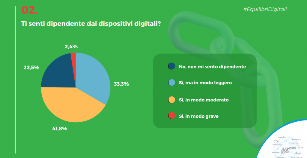 Dai dati emerge un quadro preoccupante: il 77,5% degli studenti tra gli 11 e i 18 anni dichiara di sentirsi dipendente dai dispositivi digitali, in aumento di quasi cinque punti percentuali rispetto all’anno precedente (72,6%). Una consapevolezza diffusa che però non si traduce automaticamente nella capacità di ridurre il tempo trascorso davanti agli schermi.