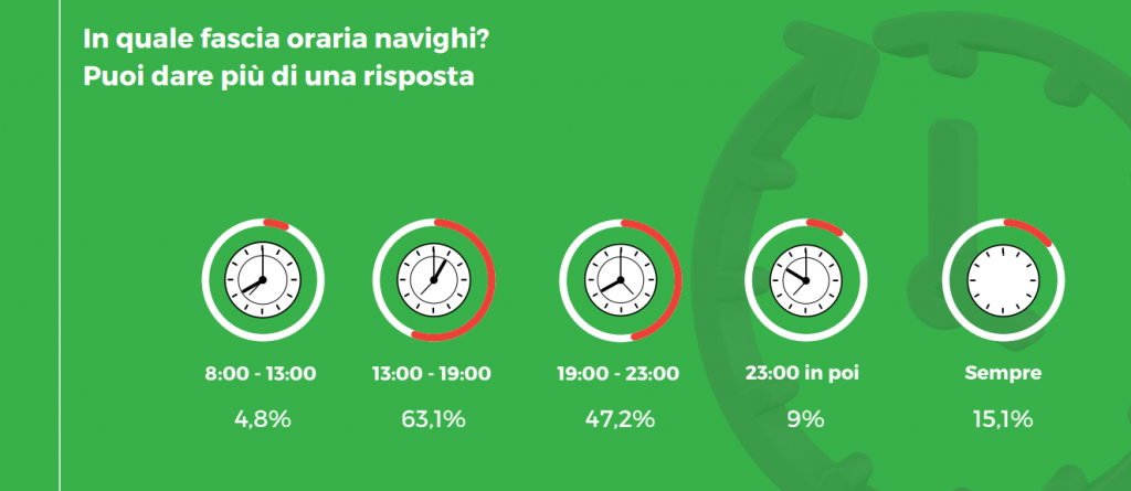 Parallelamente cresce il tempo trascorso online nelle fasce più sensibili della giornata: aumenta infatti in modo significativo la navigazione tra le 13.00 e le 19.00– con un incremento di oltre sei punti percentuali- e continua a crescere anche la fascia serale 19.00–23.00. Ore tradizionalmente dedicate allo studio, alle relazioni e al riposo risultano sempre più assorbite dalla connessione continua.