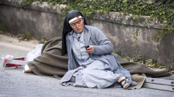 Una delle foto simbolo del terremoto: Suor Mariana, la monaca albanese vicino ad una vittima del terremoto, che manda un sms
