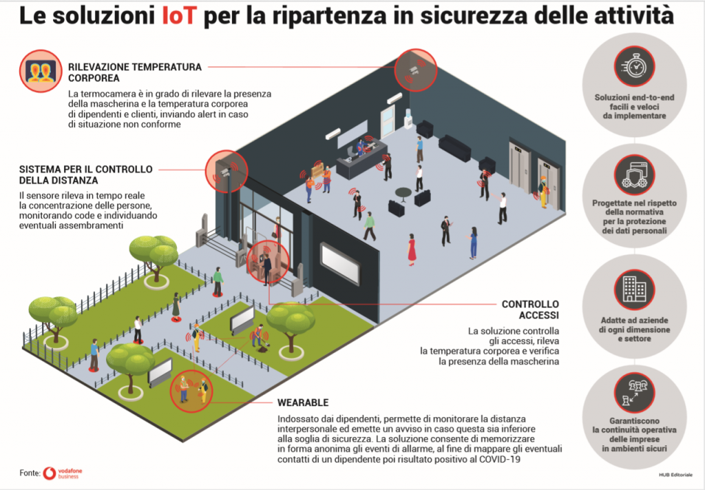 Vodafone Business, la divisione di Vodafone Italia dedicata alle piccole, medie, grandi aziende e alla Pubblica Amministrazione e un piano di investimenti incrementali da 240 milioni, lancia una gamma completa di soluzioni per rispondere in modo puntuale alle esigenze delle imprese e aiutarle nella fase di ripartenza delle loro attività. Per riavviare il business in ambienti sicuri e protetti, Vodafone offre un portafoglio di strumenti e servizi innovativi che imprese e amministrazioni di ogni dimensione e settore possono adottare in modo agile e veloce. Si tratta di soluzioni IoT disegnate per rispondere alle esigenze di distanziamento sociale e di monitoraggio della temperatura corporea necessarie per garantire la ripresa.